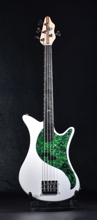 Fully customizable to your taste and needs. The instrument pictured is in matte white with glitter green pickguard and custom fret markers including our newly designed 12th fret snake inlay.