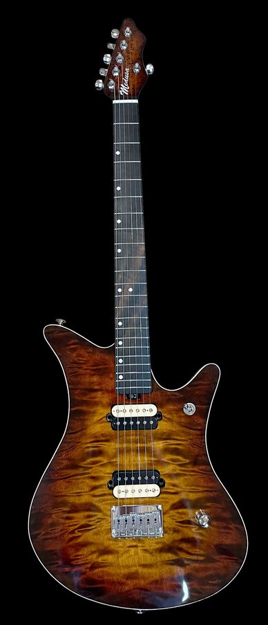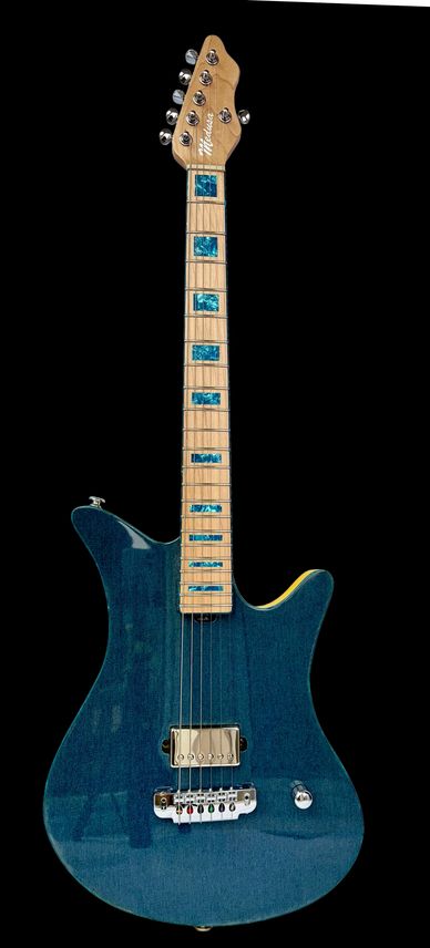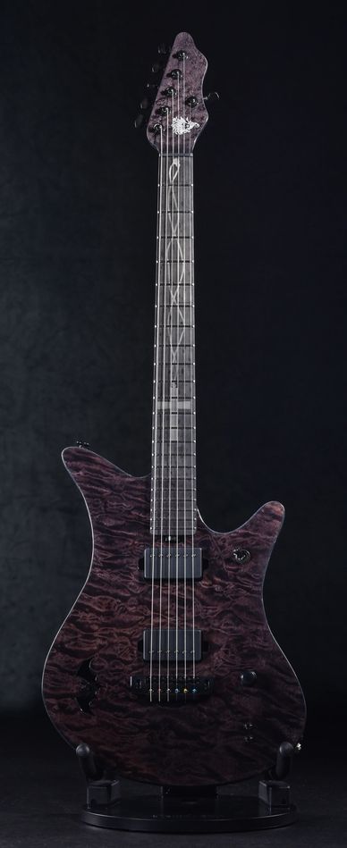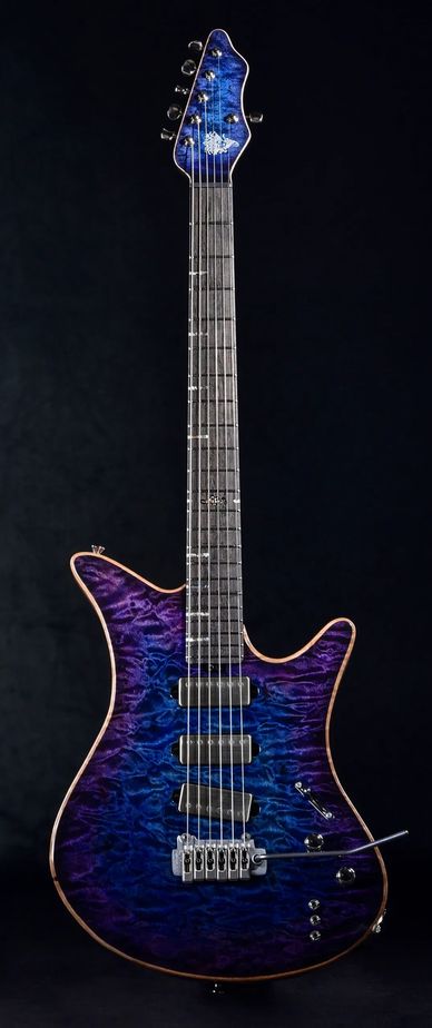 The most versatile and arguably beautiful instrument we’ve ever built. One piece sapele body with one piece quilted maple top. Quilted maple neck with ancient bog oak fingerboard. Custom abalone and luminlay inlays with snake inlay on the 12th fret. Three hand wound mini humbuckers from Old Bones with individual coil taps, Gotoh locking tuners and Wilkinson vs100 tremolo system. Other colours and bridge options available.